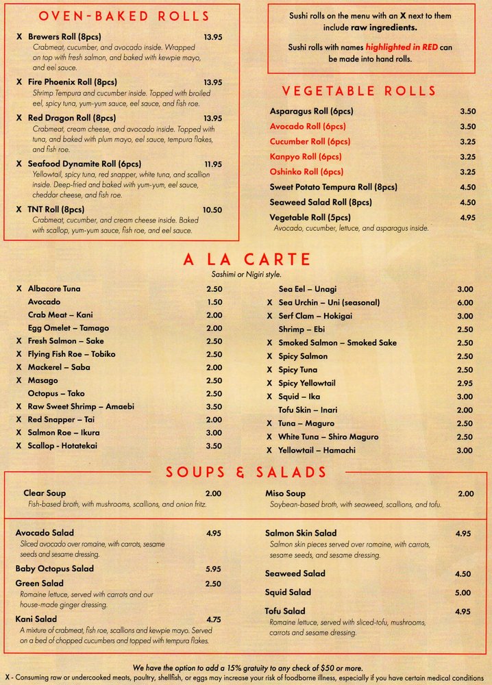 Fish tempura, cream cheese, and imitation crab meat inside. Topped with spicy tuna and imitation crabmeat tempura. Finished with plum mayo, sriracha and black sesame seeds. (pcs)